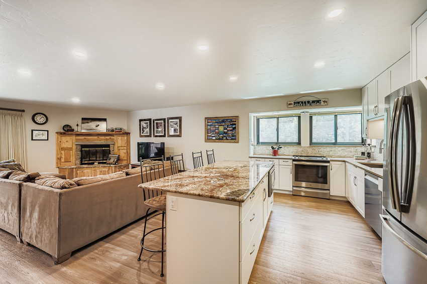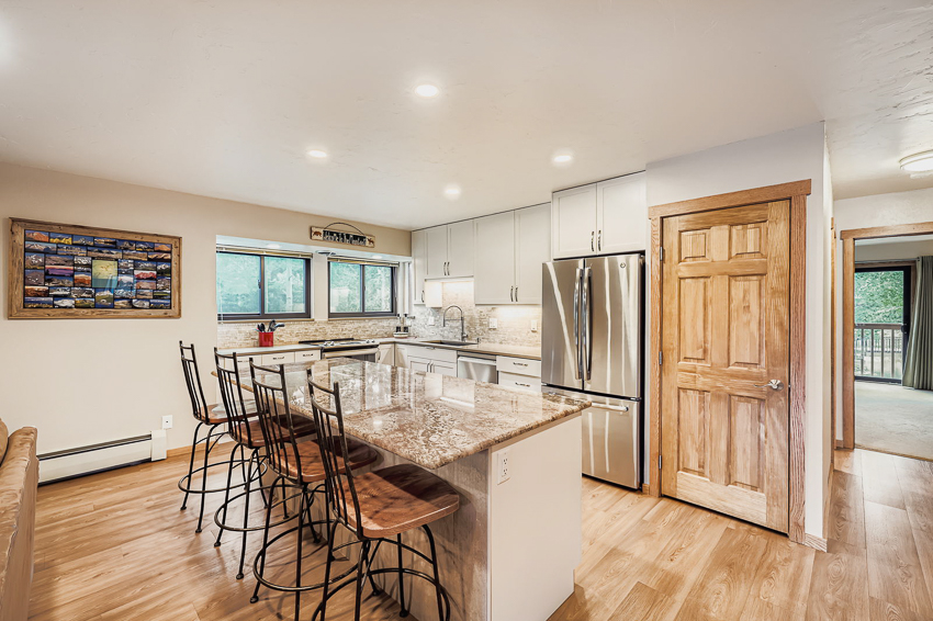 SOLD! Supersized one bedroom, bath and 3/4 bath condominium boasting over 1,100 Sq feet of mountain luxury. This upgraded property features luxury vinyl plank flooring, new patio sliding doors, new kitchen windows, new upscale kitchen cabinets with additional storage capacity, quartz and granite countertops, and added LED lighting. Downstairs enjoy a spacious tandem private two car garage and workspace. This property overlooks the peaceful lagoon with mountain views from the bedroom deck bathed with sunny afternoon light. Multiple homeowner’s amenities include heated indoor pool, hot tubs, fitness center, tennis/pickleball courts, and fishing pond. Only a short walk to free shuttles and grocery stores, located adjacent to Lake Dillon rec path and central to 5 major ski resorts.